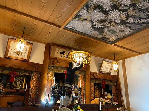 本堂で法要を営むことも多くなり、使用頻度も増えたため、全面、照明器具の取り換え工事を行いました。